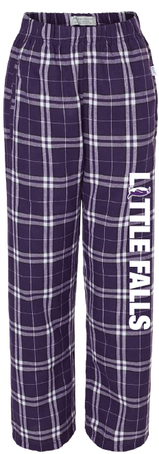 Purple / White - Super soft and comfortable PJ Pants by Boxercraft with Little Falls screen printed down the side of the leg. Youth and Adult unisex sizing available for this product.